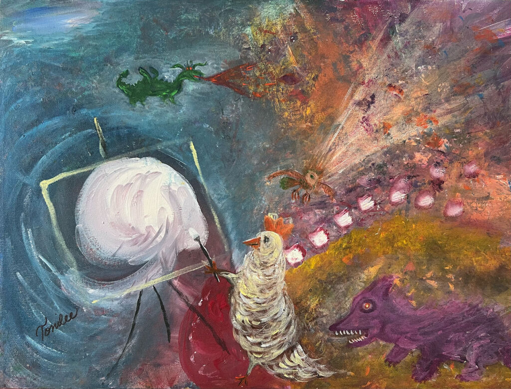 Inspired by the Artworks of Stanislao Lepri. The painting below done in 2007 was enhanced above with the character. The painting chicken was inspired by Master Rassouli calling us chicken painters and encouraging us to be ridiculous.