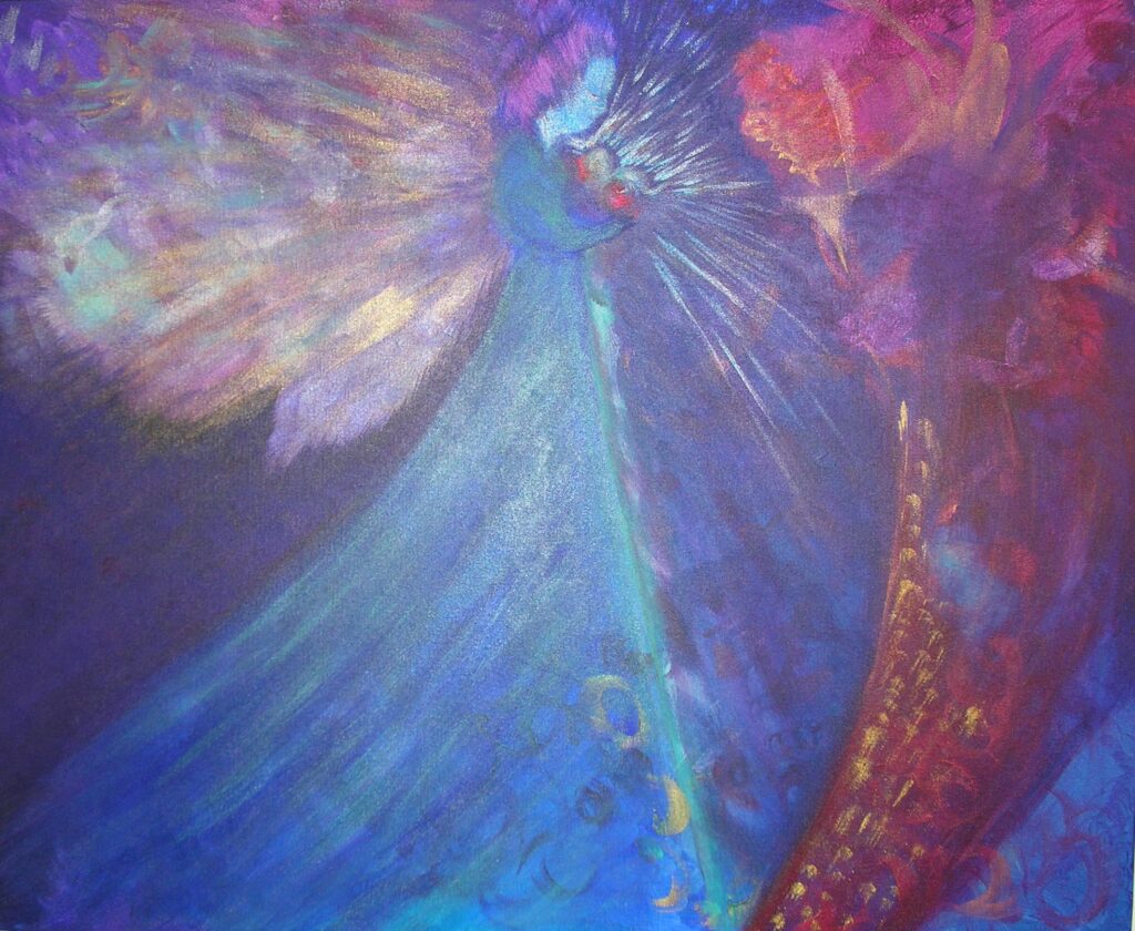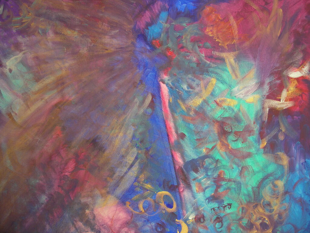 Inspired by my daughter Jessica expecting her first child. This was painted before Alejandro was born. Below is an early stage of the painting when it was all chaos and I couldn’t see the baby that wanted to come forth.